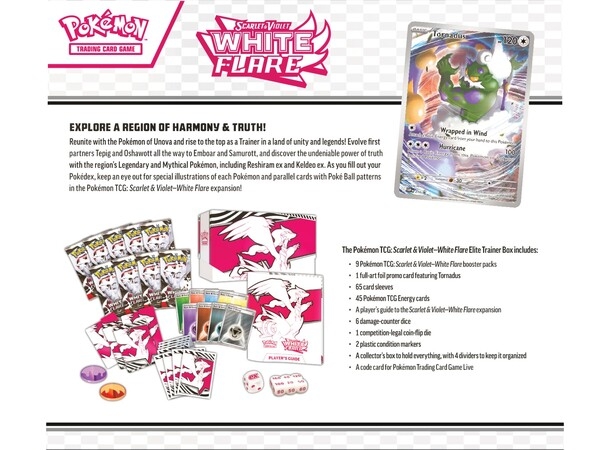 White Flare Elite Trainer Box Reis inn i hjertet av Unova med Scarlet & Violet-White Flare Elite Trainer Box, der harmoni og sannhet viser deg veien til å bli en topp Pokémon-trener. Dette er en smekkfull ETB av godsaker! PrisNOK999,00 inkl. mva. På lager Kjøp Ønskeliste Vipps hurtigkasseKjøp nå med Vipps hurtigkasse Del dette Produktinfo Produktanmeldelser (0) Boksen inneholder: 9 boosterpakker: Utvid samlingen din med 9 Scarlet & Violet-White Flare booster-pakker Eksklusivt fullkunstkort: Inkluderer en foliepromo med den mektige Tornadus Førsteklasses tilbehør: 65 kort sleeves, 45 energikort, tilstandsmarkører og skade-tellerterninger Ekstrautstyr for samlere: Inkluderer en oppbevaringsboks med fire skillevegger og en spillerguide til utvidelsen Digital bonus: Lås opp digitale belønninger med et kodekort for Pokémon TCG Live Fantastisk grafikk: Se opp for spesielle illustrasjonssjeldne kort og Poké Ball-mønstrede parallelle foliekort Her er noen av hitsene du kan få fra dette settet: Skriv en produktanmeldelse og del dine erfaringer med dette produktet med andre kunder. Email Navn Din vurdering? 1 star 2 star 3 star 4 star 5 star 6 star Oppgi en tittel for anmeldelsen din Skriv inn produktanmeldelsen i feltet under